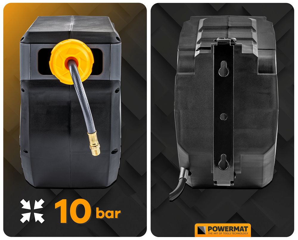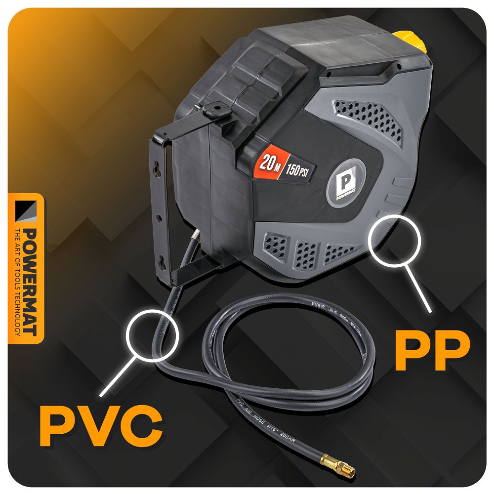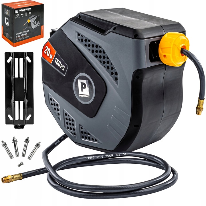 Automatický hadicový naviják, 20m | PM-ABNW-20MN je spolehlivé a praktické zařízení určené pro snadné a přehledné uskladnění vzduchové hadice. Naviják je ideální pro dílny, zahrádky, zahrady a domácí technické prostory. Lehce zvyšuje rozsah čistících úloh a umožňuje pohodlné používání pneumatických nástrojů. Průměr 5/16” a konektor 1/4“ usnadňují integraci s běžnými rychlospojkami. Kompatibilita urychluje instalaci a servis bez dodatečných adaptérů.