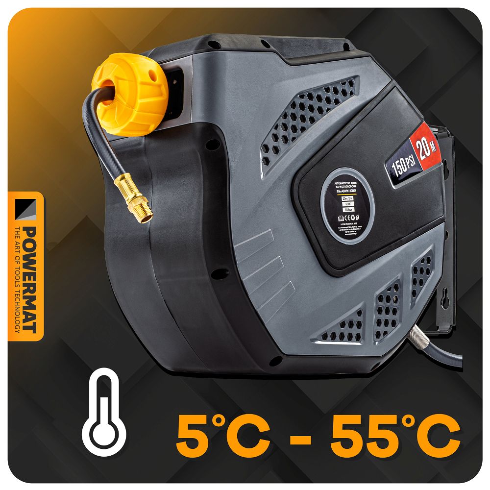 Automatický mechanismus umožňuje rychlé a plynulé navíjení hadice s plnou kontrolou délky. Hadice o délce 20 m poskytuje široký dosah a pohodlné používání. Flexibilní PVC hadice odolává tlaku až 150 PSI a pracuje v teplotním rozsahu 5–55 °C. Odolné PP pouzdro chrání zařízení před poškozením a povětrnostními vlivy.