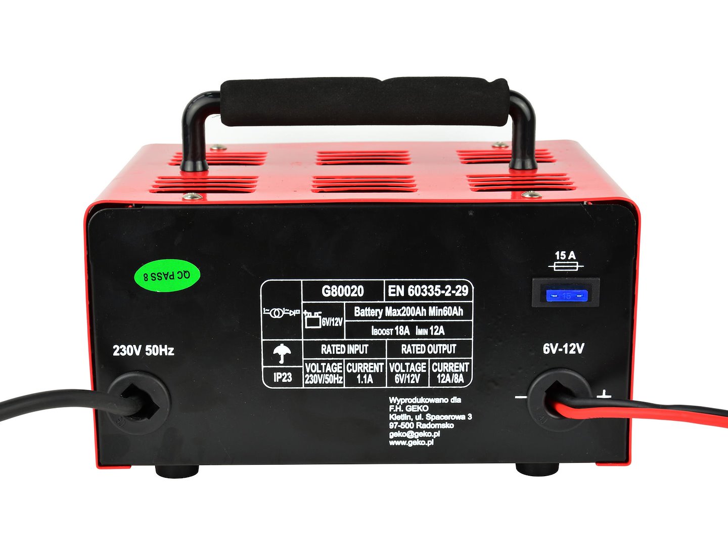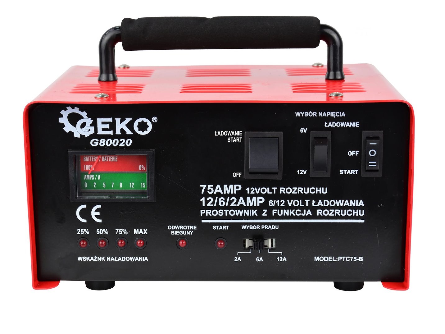 Autonabíječka se startérem, 75A, 6/12V | GEKO slouží k nabíjení i rychlému oživení vybitých baterií v autech či motocyklech. Nabíječka se startovací funkcí je určena na pomoc při startování a nabíjení olověných baterií s napětím 6 V nebo 12 V, používaných mimo jiné v osobních automobilech, motocyklech, lodích atp.