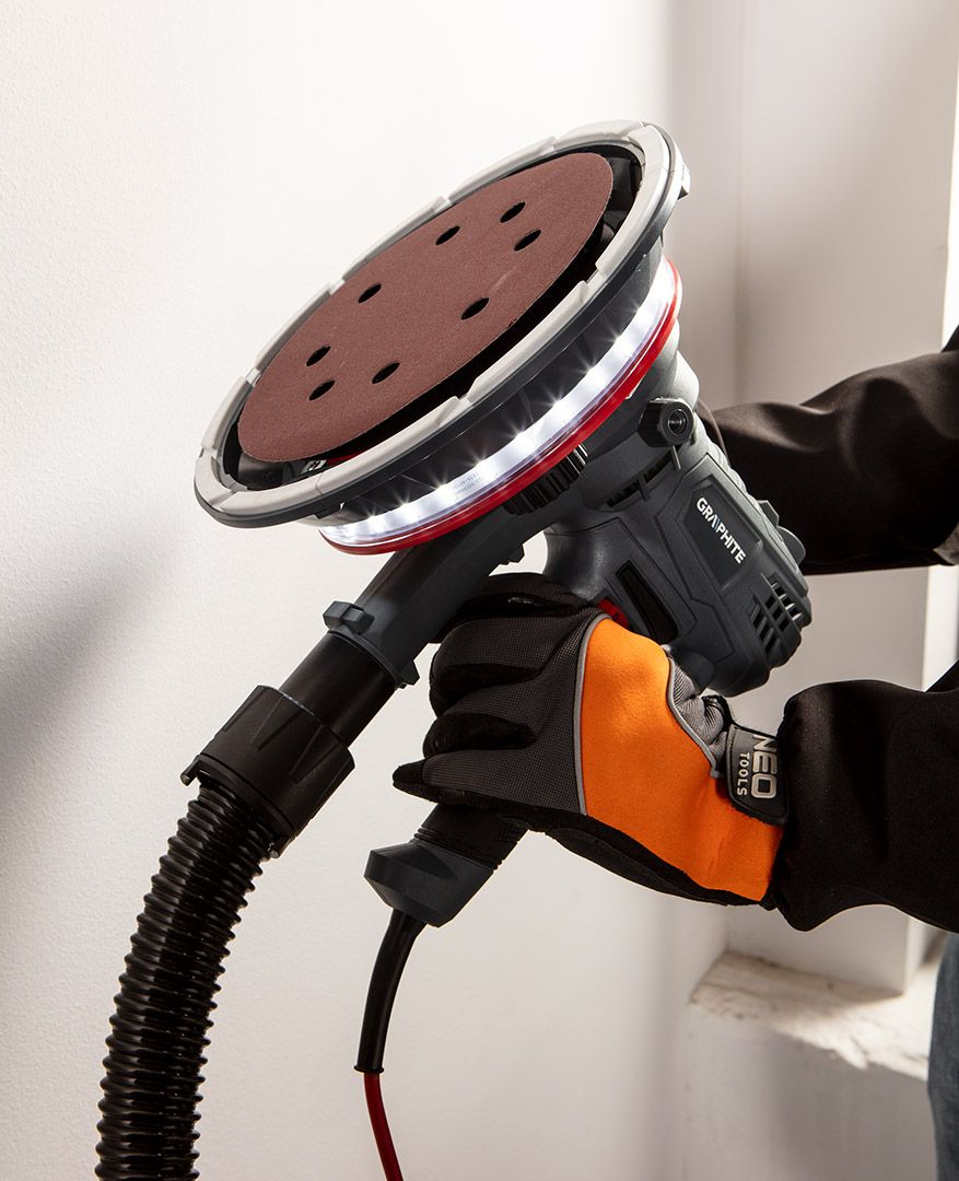 Bruska na omítku, 900W, 180mm | GRAPHITE je vysoce kvalitní zařízení pro zpracování omítkových povrchů s praktickým LED osvětlením. LED osvětlení umožňuje provádět úkoly ještě přesněji. Bruska má výkon 900 W a plynule nastavitelnou rotační hlavu s rozsahem otáček od 1400 do 2700 otáček za minutu. Brusný kotouč má průměr 180 mm.