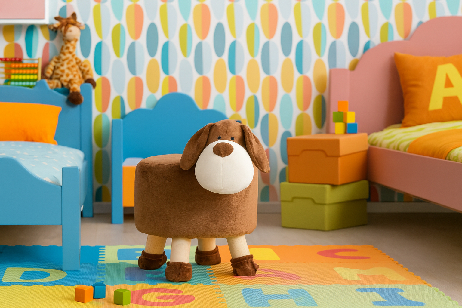 Dětská taburetka, 28x25cm | pejsek je originální doplněk, který nabízí praktické místo k sezení či odpočinku, ideální do dětského pokoje. Taburetka je vyrobena z měkkých materiálů, které umožňují pohodlné sezení, a vnitřní výplň poskytuje stabilní oporu. Díky kompaktním rozměrům se pohodlně vejde i do menších prostor, ale zároveň dodá místnosti hravý a originální nádech. Design inspirovaný žirafou osloví děti i dospělé.