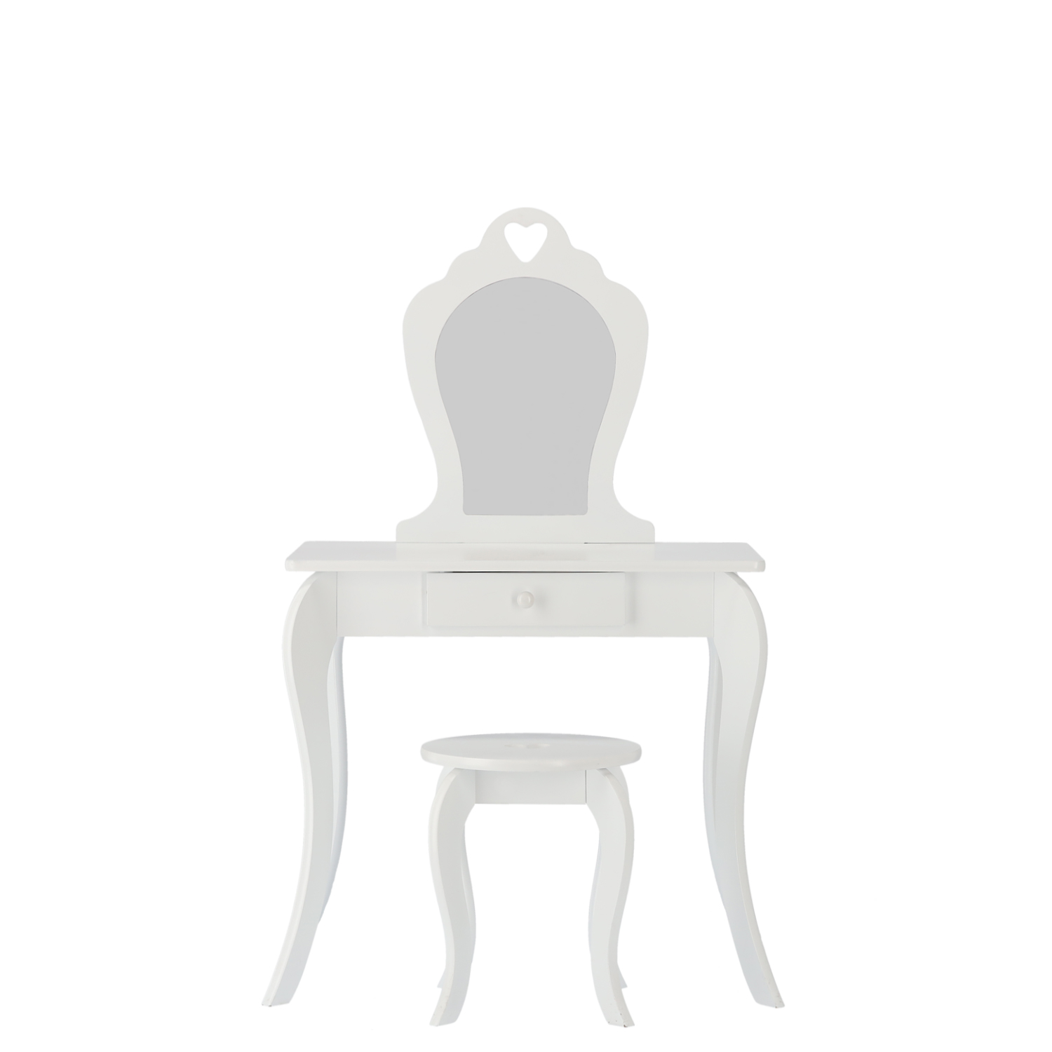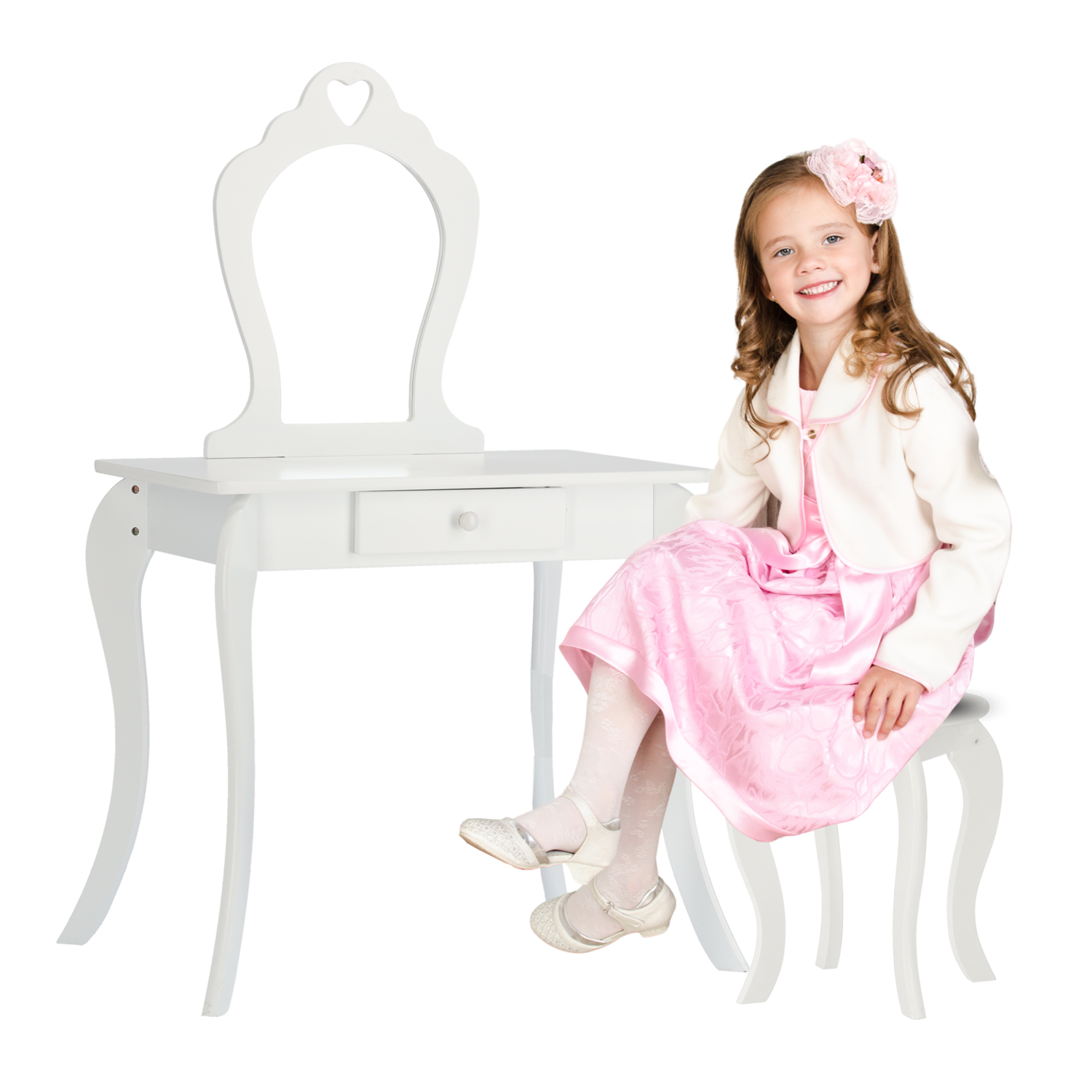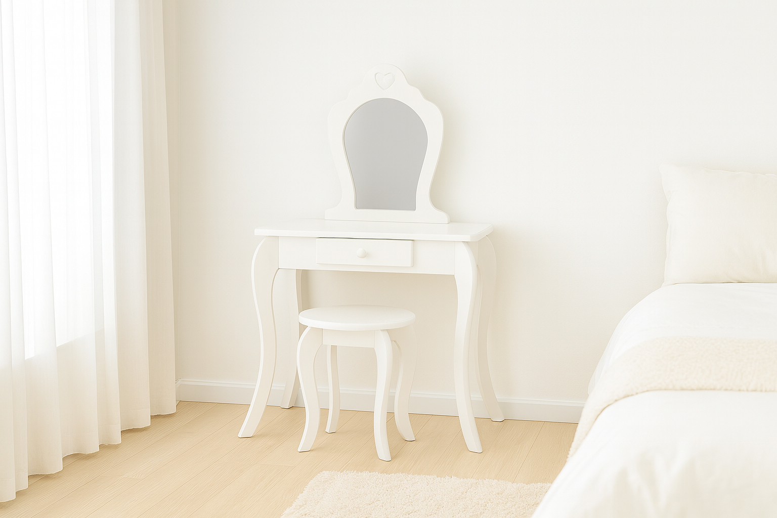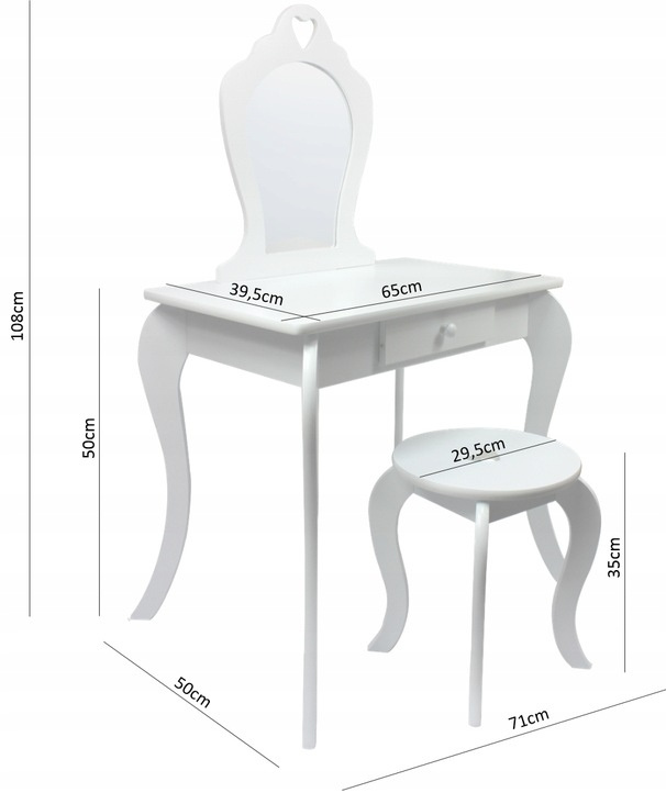 Dětský kosmetický stolek se zrcadlem | bílý je stylový kus nábytku, který doplní každý interiér a poskytne pohodlné místo pro každodenní péči. Tento elegantní stolek v bílé barvě přichází v kompletním setu se zrcadlem a taburetkou, vytvářeje stylový a zároveň funkční prostor pro denní péči či hraní.