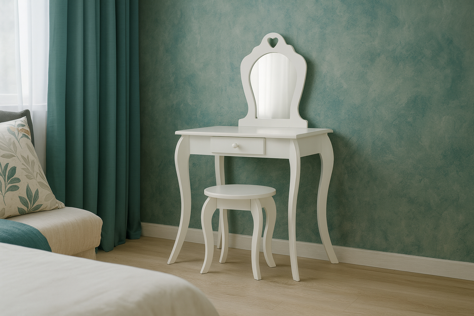 Tento toaletní stolek je navržen s možností připevnění ke stěně pro zvýšenou stabilitu, což je výhodou zejména v dětském pokoji. Celkově jde o ideální kus nábytku pro malou dámskou zónu – ať už pro holčičku, která touží po vlastním „salonku“, nebo jako doplněk elegantního interiéru. Nejenže okouzlí svým půvabným vzhledem, ale také rozvíjí kreativitu a učí pořádku v dětském pokoji.