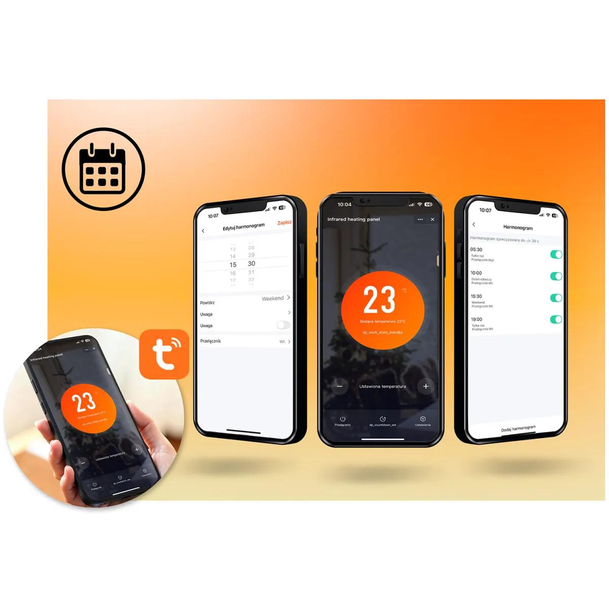 S aplikací Tuya Smart ve vašem telefonu, připojenou k panelu prostřednictvím bezdrátové sítě Wi-Fi, můžete snadno ovládat topení ve vaší domácnosti odkudkoli. S touto aplikací můžete snadno měnit nastavení, regulovat teplotu a časovač a naplánovat provoz, což vám umožní přizpůsobit podmínky vašim potřebám. Toto flexibilní řešení poskytuje pohodlí a úsporu energie tím, že umožňuje inteligentní řízení topení.