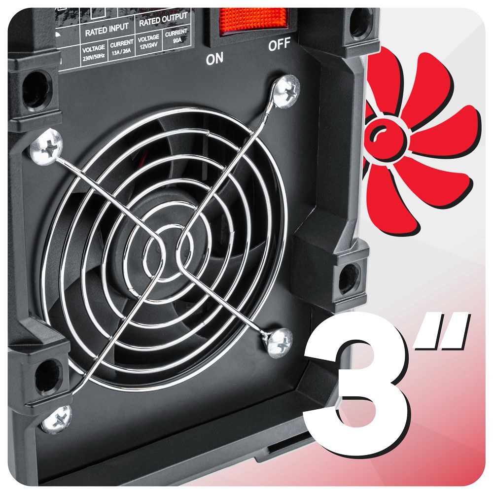 Přehledný LCD displej zobrazuje napětí a stav baterie: 14–14,5 V (dobrý), ~13,5 V (průměrný), <13 V (špatný), což usnadňuje průběžné monitorování stavu. Kryt s krytím IP65, aktivní chlazení ventilátorem a měděné kabely s pevnými gumovými svorkami zajišťují spolehlivý provoz v dílnách a garážích. Vestavěné bezpečnostní funkce chrání před přehřátím (vypnutí 150 °C s automatickým restartem), zkratem a reverzní polaritou, s okamžitým zvukovým alarmem.