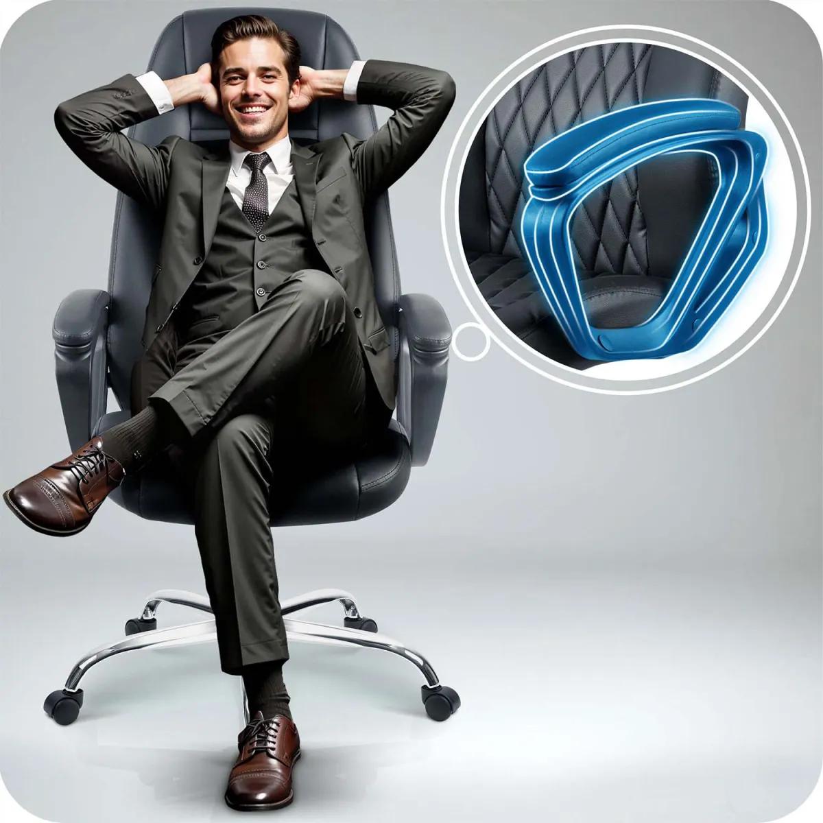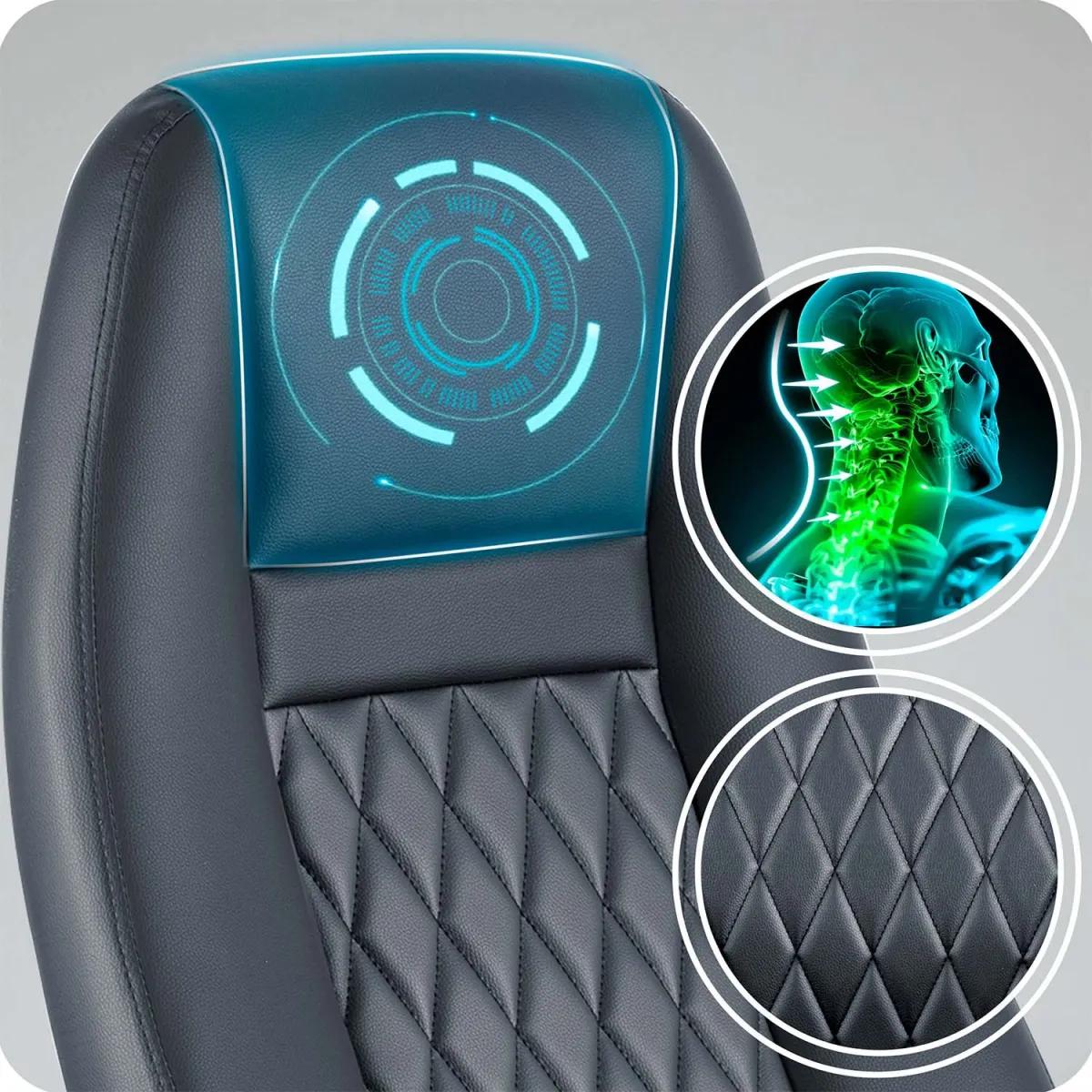 Židle nabízí široký rozsah sklonu opěradla, takže můžete kdykoli přejít z pracovní polohy do pohodlné polohy k odpočinku. Konturovaná bederní část pomáhá udržovat ergonomickou a bezpečnou polohu těla. Konturovaná opěrka hlavy rovnoměrně rozloží tlak, uvolní svaly a zabrání bolesti krku. Chromový rám z vysoce kvalitní oceli zajišťuje vyjímečnou stabilitu a odolnost a elegantní povrchová úprava je odolná vůči poškrábání a korozi.