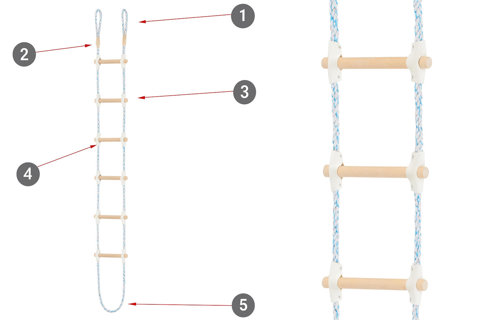 Je vyroben z 48 propletených polypropylenových vláken, které se vyznačují velmi vysokou pevností. Stroj přesně splétá vlákna a vytváří velmi pevné lano o průměru 22 mm a kulatém tvaru. Při výrobě žebříku výrobce záměrně použil polypropylen, který se vyznačuje vysokou pevností a naprostou odolností vůči povětrnostním podmínkám.