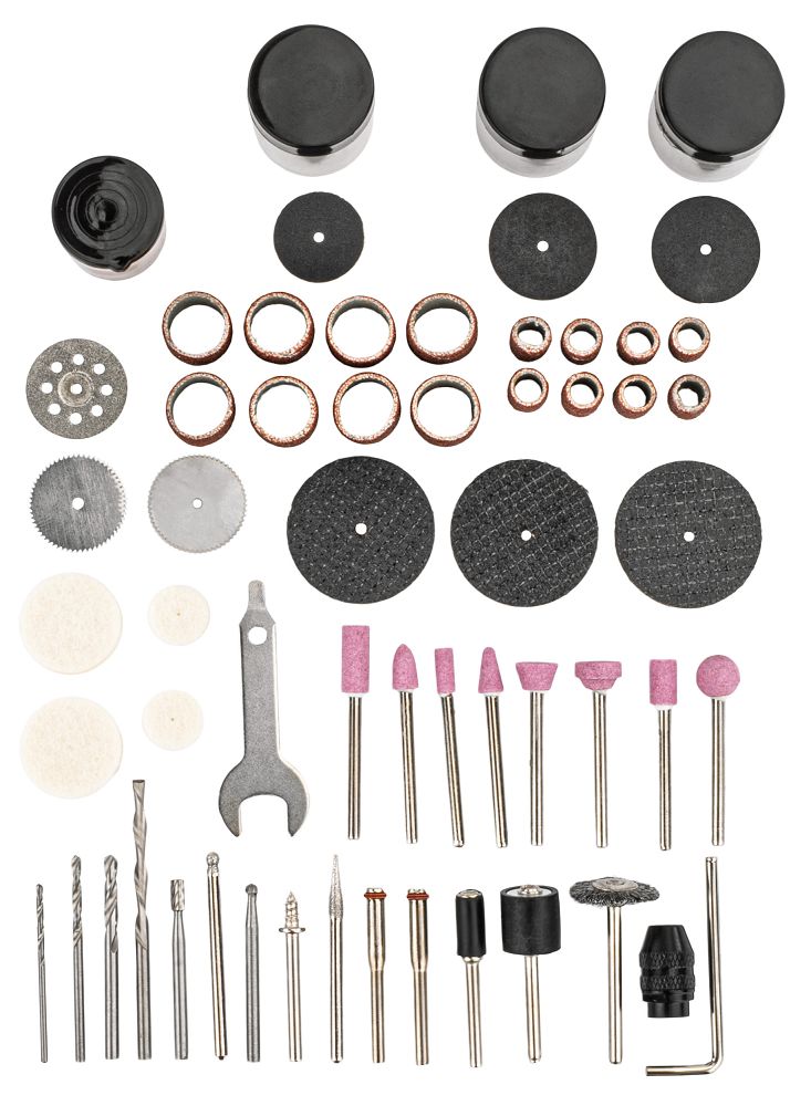 Zařízení podporuje širokou škálu vyměnitelných nástavců, jako jsou kotouče, frézy, vrtačky, kartáče a gravírovací nástavce. Snadná výměna příslušenství umožňuje rychle přizpůsobit nástroj konkrétnímu úkolu, což zvyšuje efektivitu a pohodlí práce. Sada obsahuje více než 180 pracovních doplňků, včetně fréz, kotoučů, vrtaček, kartáčů a brusných listů. Díky tomu je bruska vhodná pro mnoho použití.