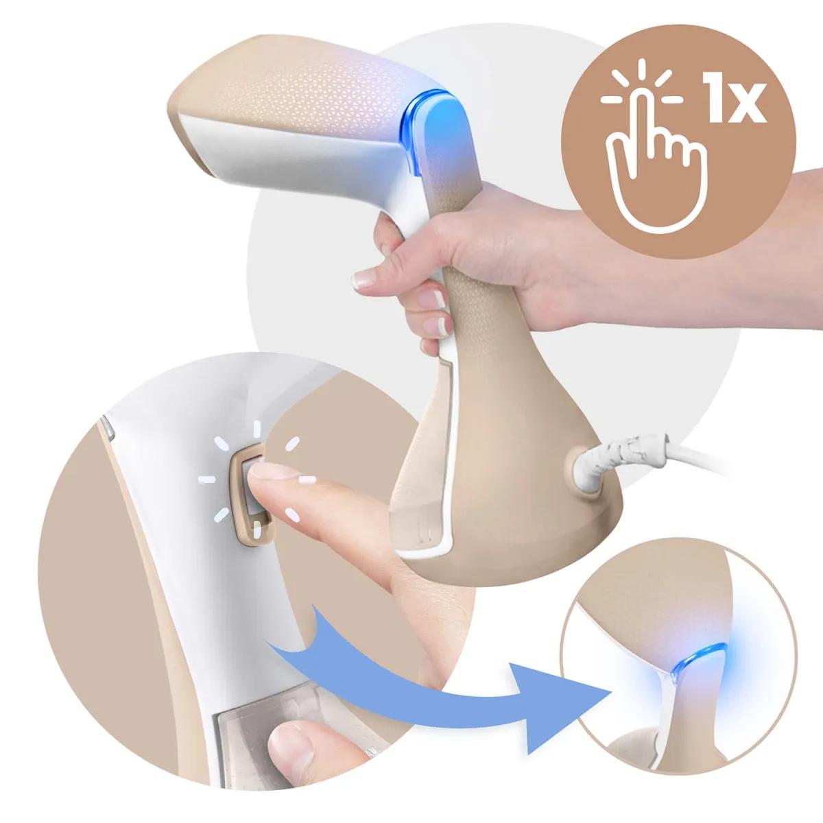 S odnímatelnou nádržkou na vodu o objemu přibližně 230 ml lze najednou zpracovat více kusů oblečení bez nutnosti častého doplňování. Zařízení se ovládá jednoduchým jediným tlačítkem, obsahuje nastavitelnou parní trysku a příslušenství jako kartáč, což umožňuje použít napařovač i na čalounění či tkaniny s vlasem nebo nitkami. Díky možnostem použití na různé textilie a kompaktním rozměrům je ideální volbou pro domácnosti, kde je požadována efektivnost a flexibilita.