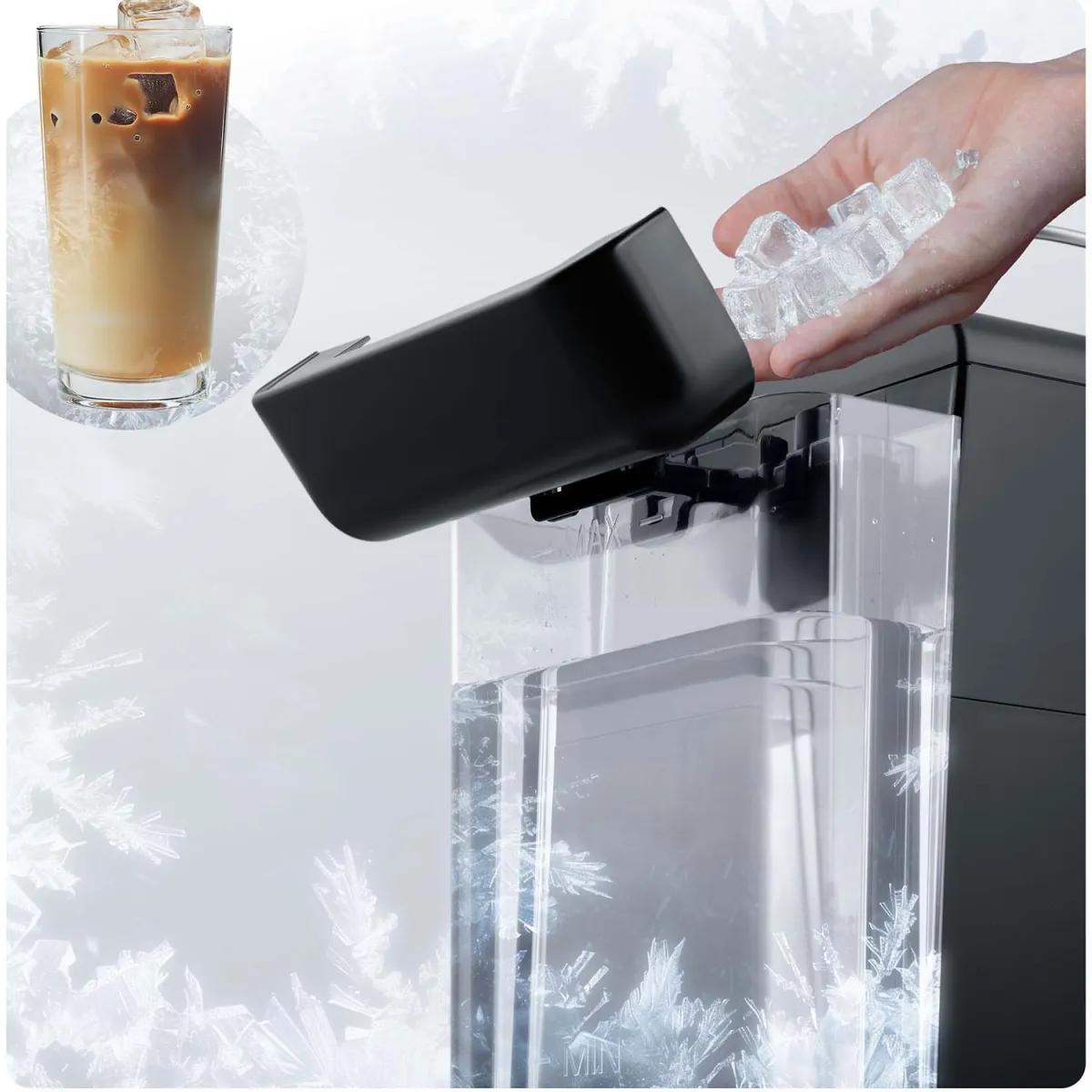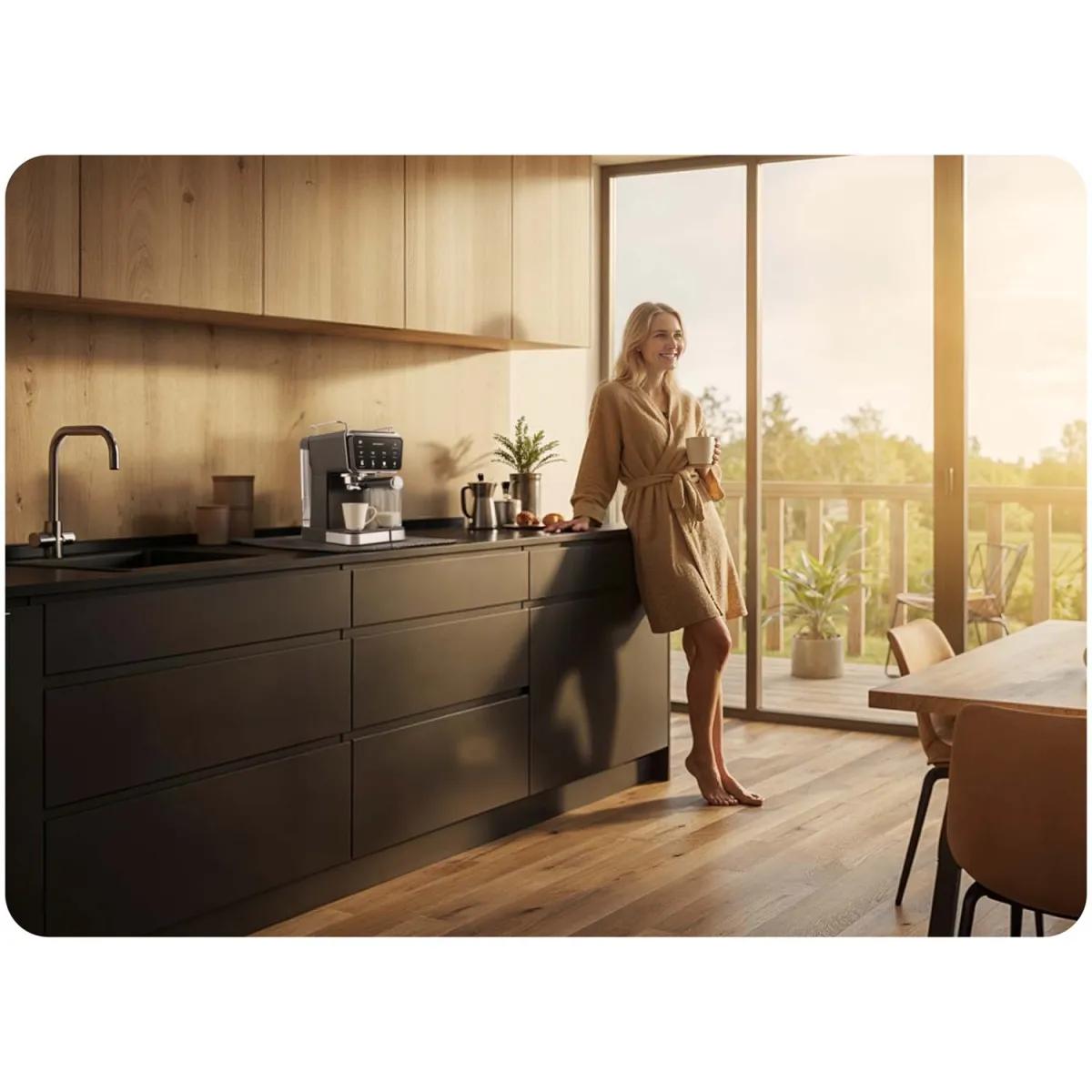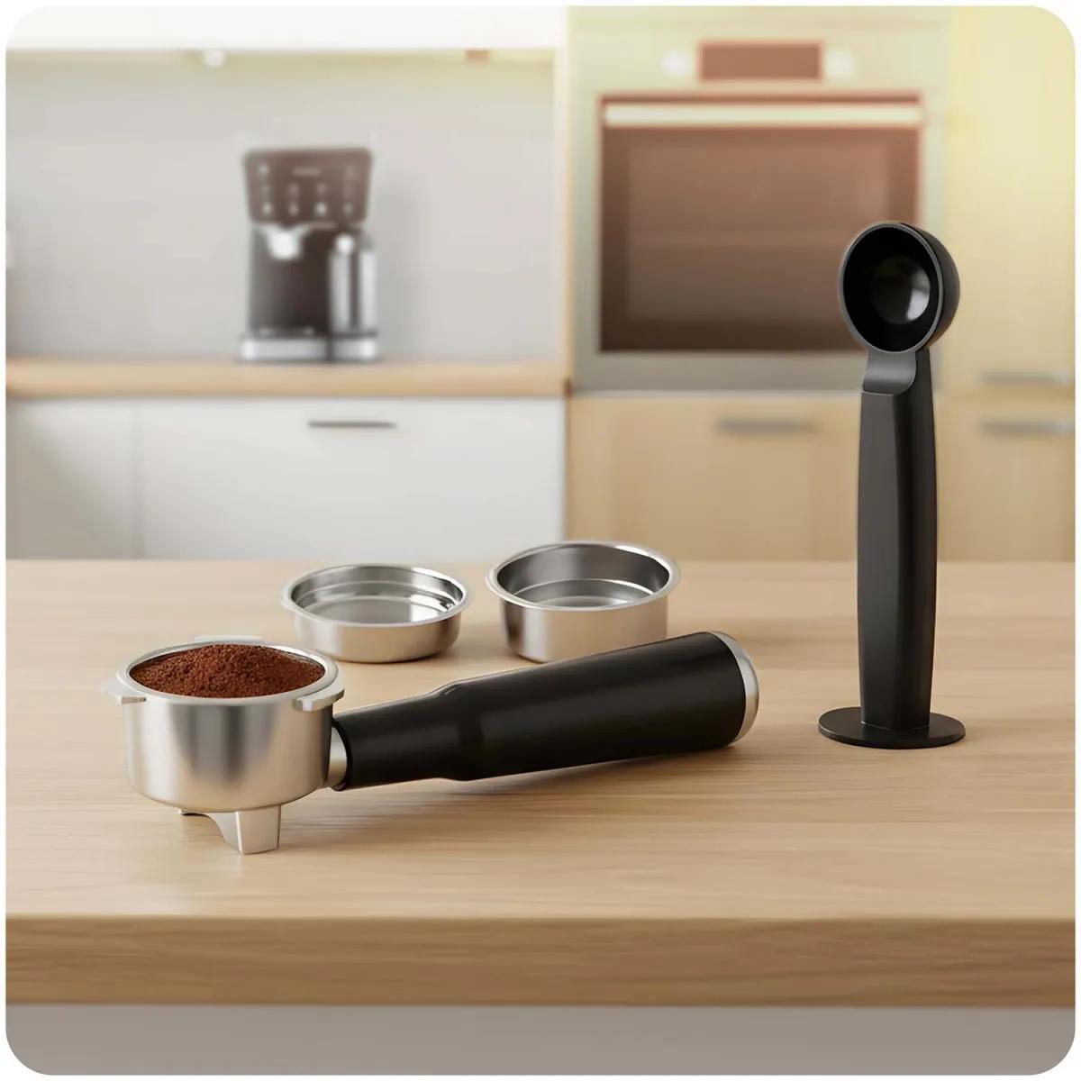 Součástí přístroje je také integrovaný napařovač mléka, který umožňuje snadno připravit krémové cappuccino, latte či jiné mléčné speciality. Kávovar disponuje odnímatelnou nádobou na vodu o objemu přibližně 1,5 litru, což umožňuje připravit více šálků bez potřeby neustálého doplňování.