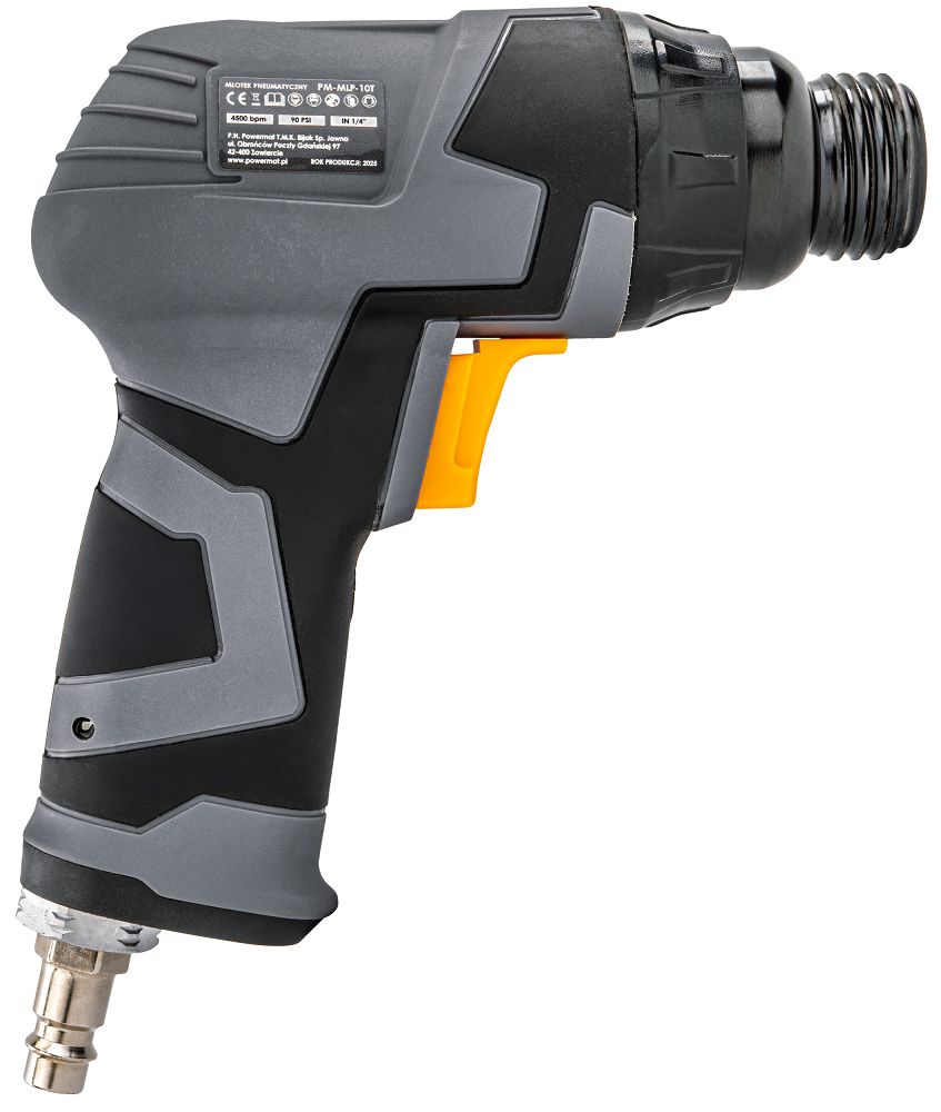 Pneumatické kladivo, 4 dláta | PM-MLP-10T nabízí vysokou výkonnost a spolehlivý výkon při různých průmyslových a servisních úkonech. Je ideální pro čištění částí karoserie před lakováním, renovaci ocelových ráfků a odstraňování zbytků svarů a pájek. Je vhodný i pro údržbářské práce na ocelových konstrukcích, opravy karoserií a přípravu povrchů pro práškové lakování.