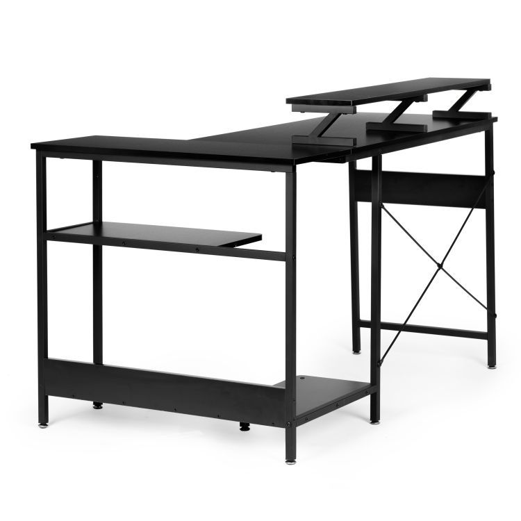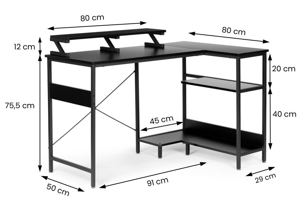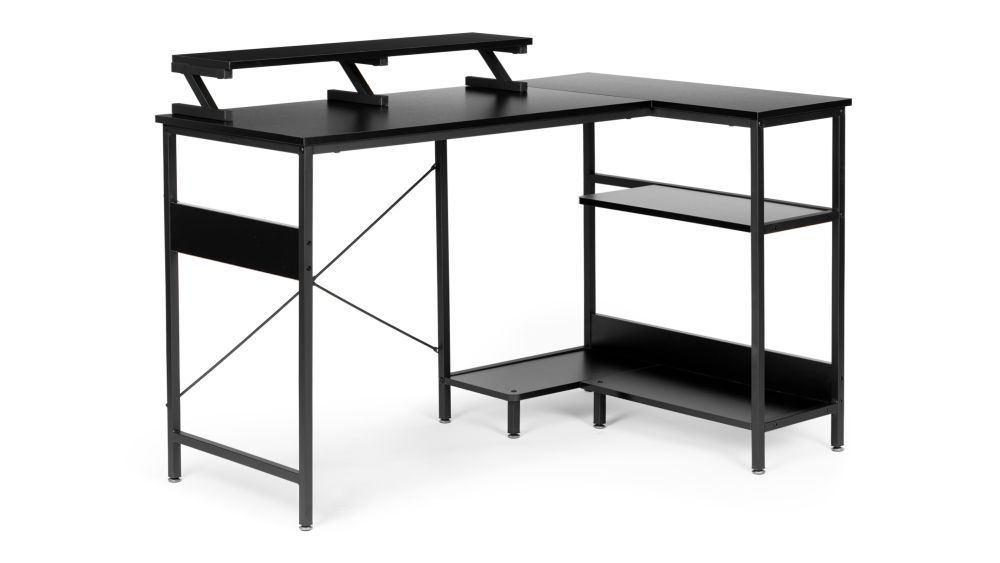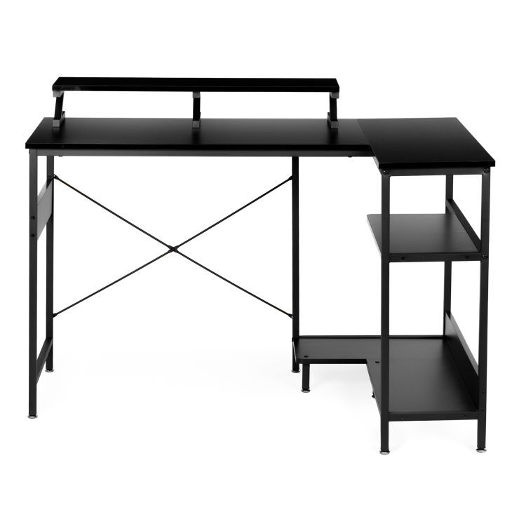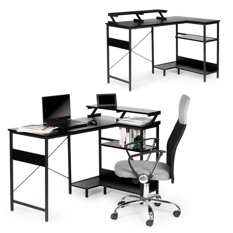 Rohový počítačový stůl, 3 police, černý | ModernHome nabízí moderní a funkční řešení pro domácí kancelář či studijní koutek. Jeho velká deska poskytuje dostatek prostoru pro práci, studium nebo hraní a odolná konstrukce z MDF a kovu zaručuje spolehlivost a odolnost. Stůl je vybaven dvěma policemi a další funkční policí na vrchu, což umožňuje snadné uložení všech potřebných věcí. Díky nastavitelným nožičkám lze stůl dokonale vyrovnat a nožičky zároveň chrání podlahu před poškrábáním.