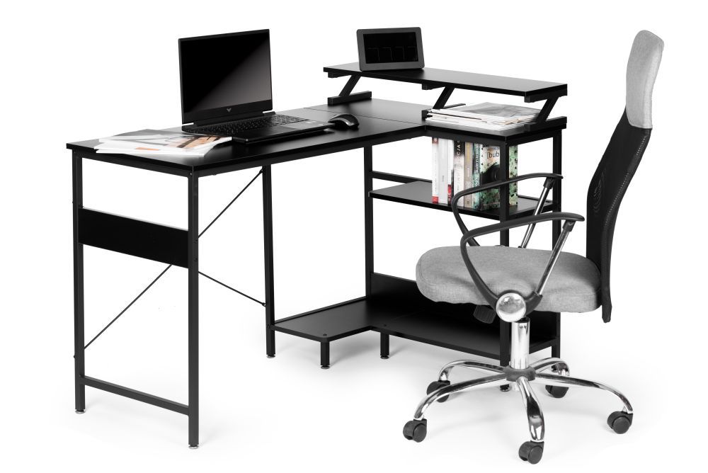 Rohový počítačový stůl, 3 police, černý | ModernHome