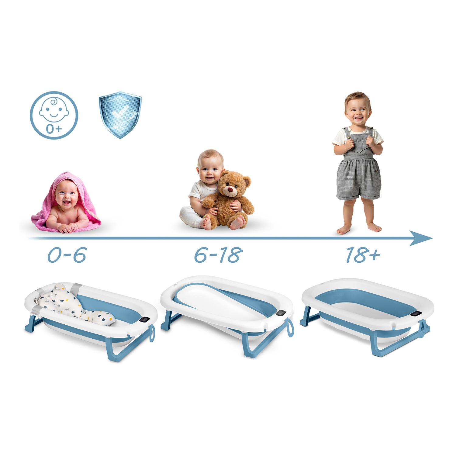 Konstrukce kombinuje odolné plastové materiály, které dobře snášejí vlhkost a časté vystavování vodě. Díky kombinaci skládacího designu, teploměru, pohodlí a bezpečnosti je tato vanička vhodná pro novorozence i batolata, a stává se výhodnou volbou pro rodiče, kteří hledají praktické řešení ke koupání doma i na cestách.