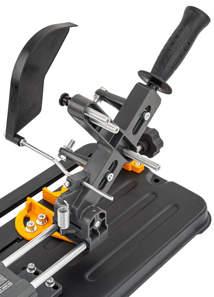 Stojan umožňuje přesné nastavení a udržení maximální hloubky řezu 65 mm, což umožňuje zpracování silnějších kovových prvků. Tato vlastnost zvyšuje rozsah použití a poskytuje větší volnost při práci v dílně. Vodítko se pohybuje plynule díky dvěma kovovým tyčím a kluzným ložiskům, čímž se eliminuje vůle a zasekávání. Silná pružina s funkcí automatického návratu zvedne vodítko po řezání, čímž se zvýší rychlost a pohodlí práce.