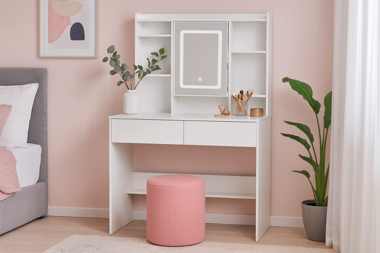 Díky LED-osvětlení je vaše příprava rovnoměrně osvětlená – ideální pro líčení nebo úpravu vlasů. Čistý bílý design s minimalistickými liniemi dodává vašemu interiéru moderní a uklizený vzhled. Tento kousíček nábytku se výborně hodí do ložnice či šatny a zároveň pomáhá udržet pořádek.