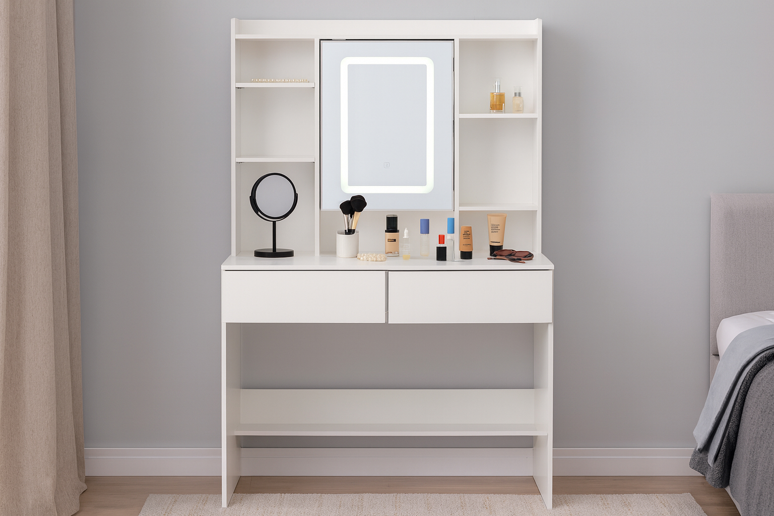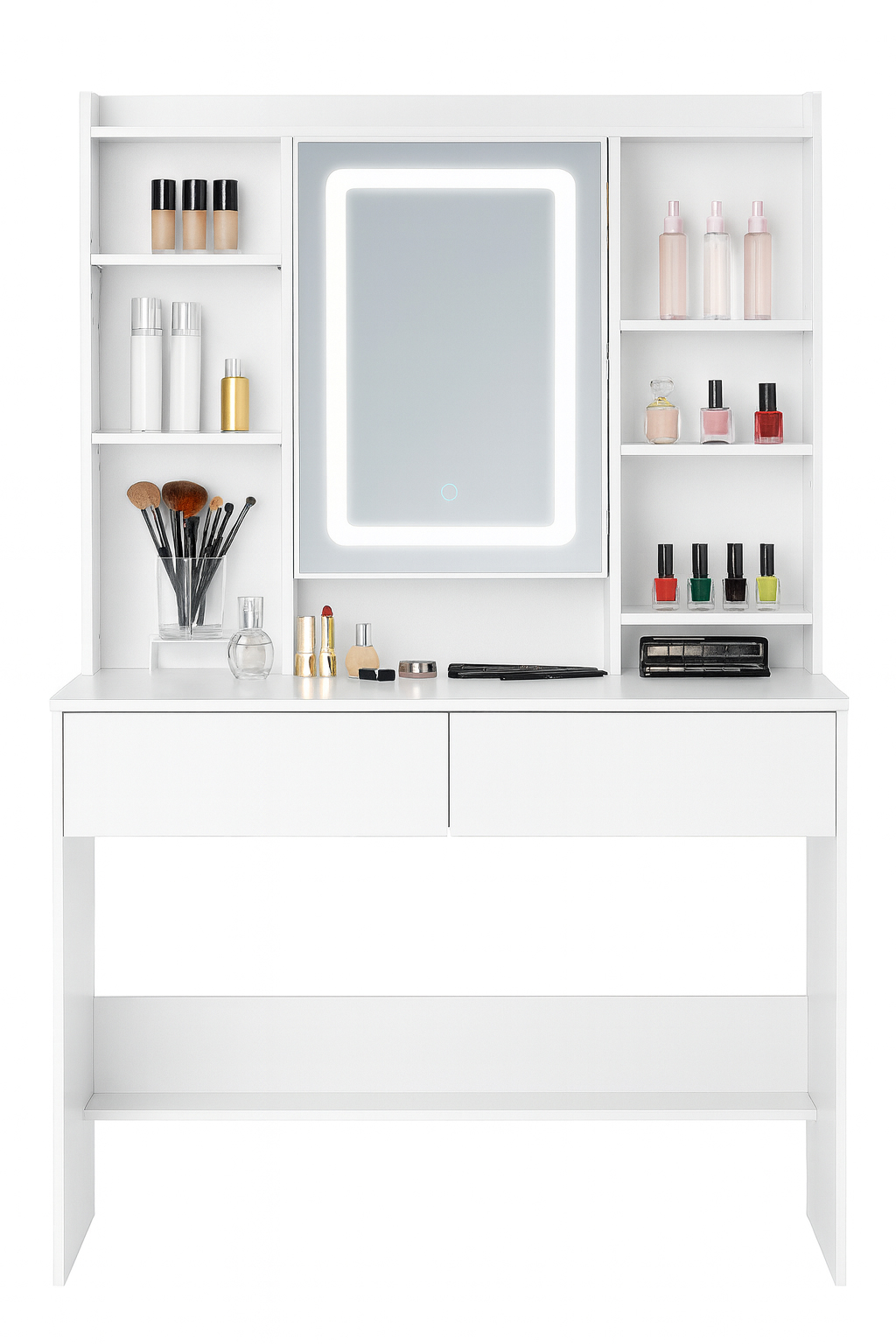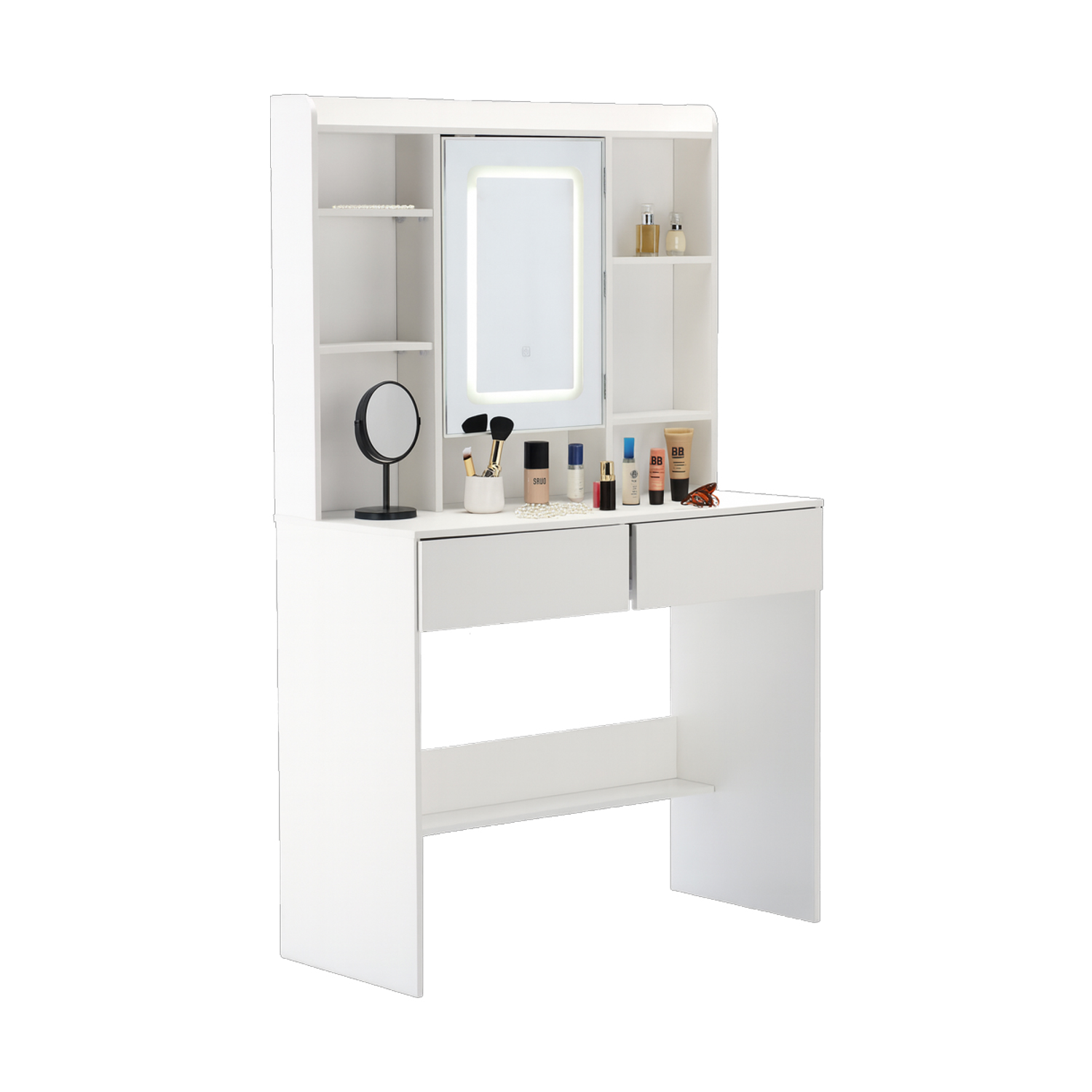 Toaletní stolek s LED osvětlením | bílý je elegantní a praktický kus nábytku, který nabízí stylové místo pro kosmetickou či relaxační zónu. Stolek nabízí stylové a zároveň praktické řešení pro každodenní péči o vzhled. Pracovní plocha vám poskytne dostatek místa pro kosmetiku a doplňky, zatímco několik polic umožní přehledně odložit náhrdelníky, náušnice či parfémy.