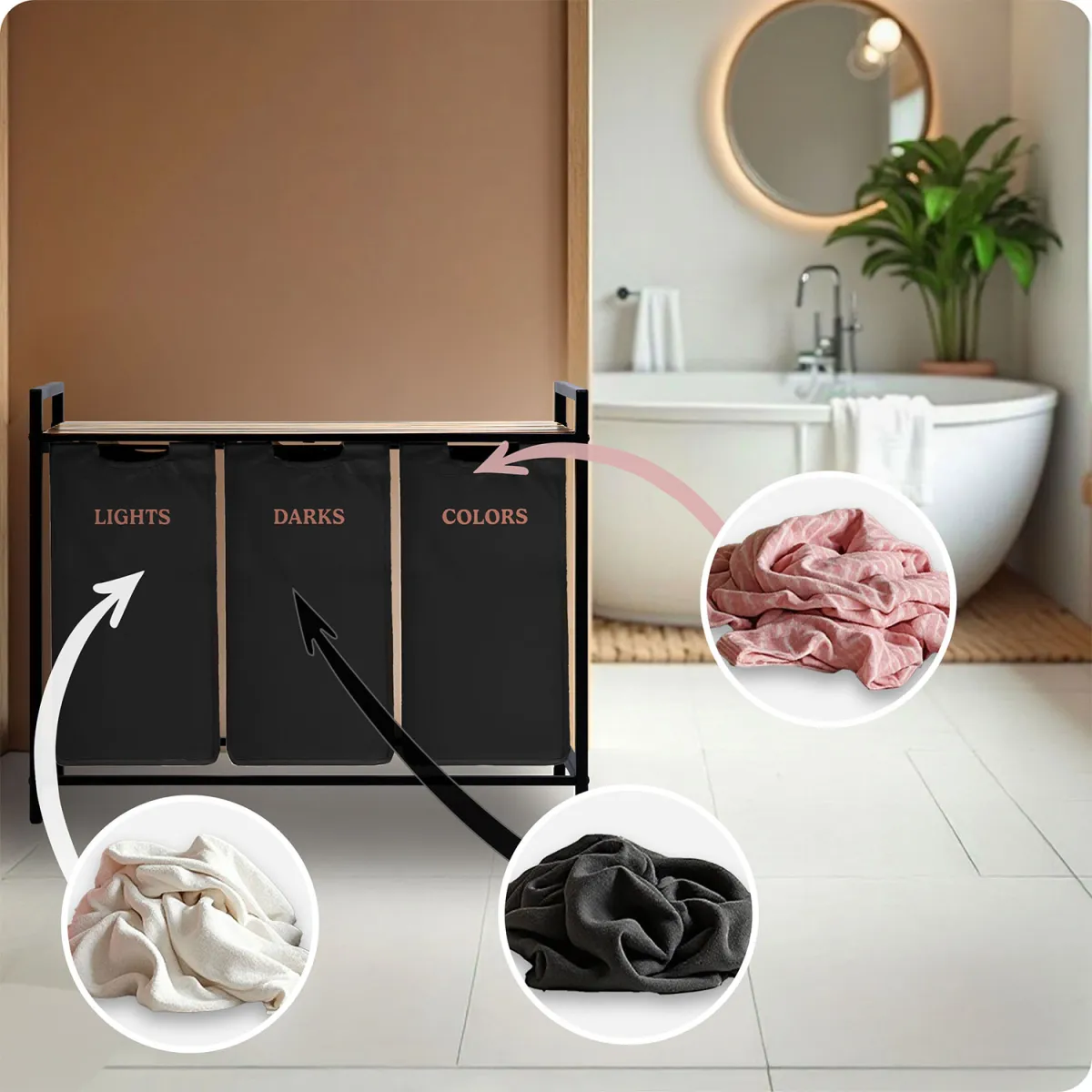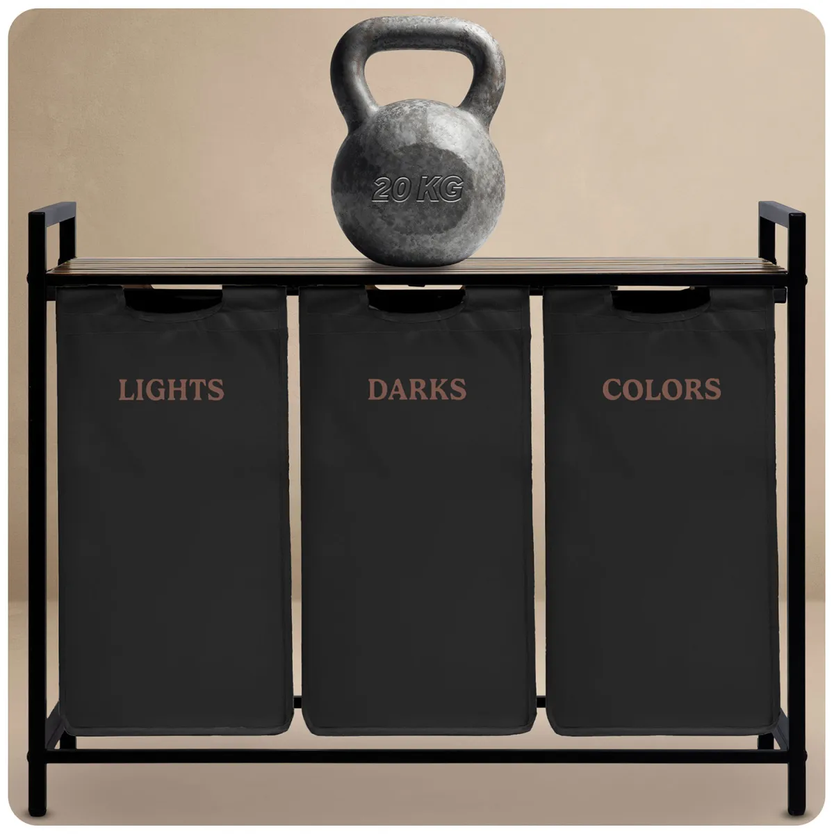 Tříkomorový koš na prádlo s rámem, 120L, černý | Massido nabízí praktické řešení pro třídění prádla v domácnosti v moderním provedení. Jeho pevná konstrukce kombinuje stabilní kovový rám s lehkou, ale odolnou textilní vložkou, která je rozdělena na tři samostatné přihrádky – ideální pro třídění světlého, tmavého a barevného prádla již při vkládání.